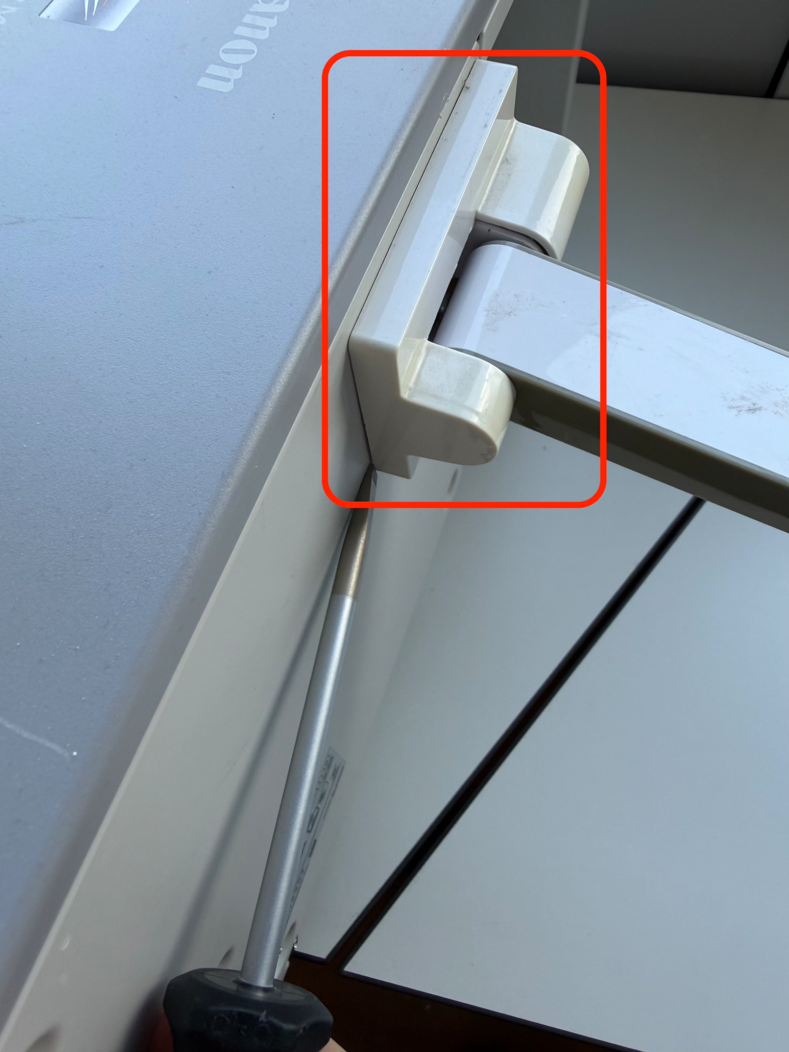 Den Schraubenzieher zwischen Metallplatte und Abdeckung ansetzen und die Abdeckung vorsichtig aufhebeln. Anschließend nach hinten schieben, um die Schrauben zugänglich zu machen.